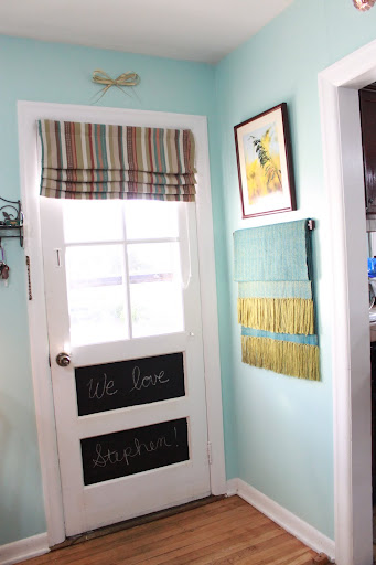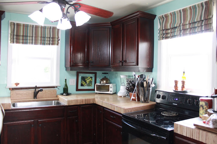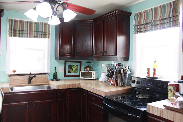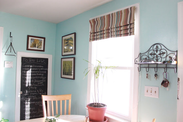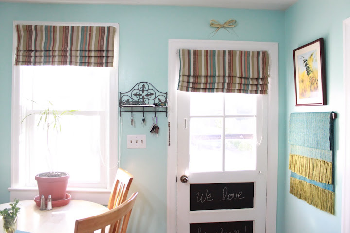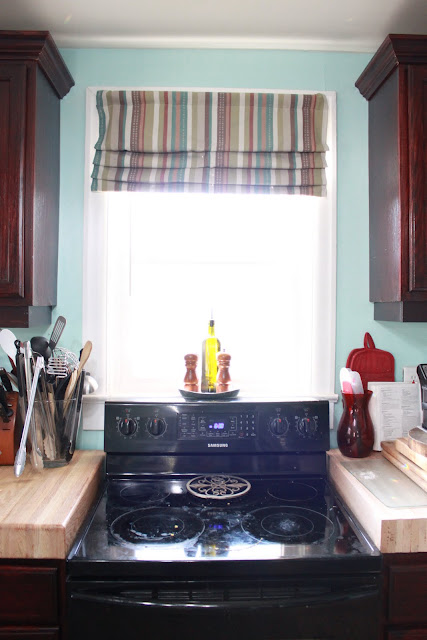 Did I mention that the striped fabric is my sister's old shower curtain?? Yes. You heard me. Her shower curtain. Crazy, I know, but when I cut it into fourths, there was just enough fabric to make shades for all four of my kitchen windows. It was meant to be.