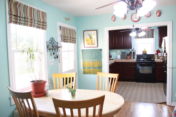 I think the shades work really well with the rug as well. I'll share more about the artwork in the kitchen in a later blog post. For now, I'm just going to enjoy my candy striped windows.