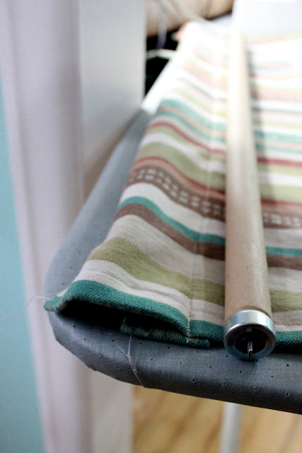 Anyways, back to the destiny of that fabulous striped fabric. After coming across fixed flat roman shade tutorials at both Centsational Girl and Fly Through Our Window, I'd been itching to make some for my kitchen. So I put on my sewing cap and got to work. In my kitchen. Is it weird to sew in your kitchen?? Inquiring minds want to know.