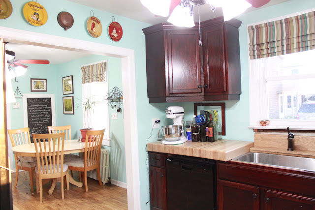 It's super cheerful. Like "you WILL smile while you scrub dishes" cheerful. When I first painted the kitchen, I kept waffling back and forth between, "I LOVE IT!" and "OH, GOD, WHAT HAVE I DONE?!?" Now that I've lived with it for a while, I definitely love it.