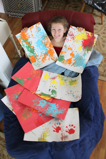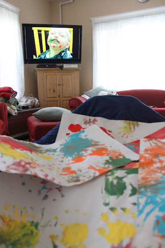 Stephen & Joseph surprised me with Joseph's masterful works of art after Mass & pancake breakfast with my Mom this morning. Stephen sat me down in the recliner, popped my feet up, tucked me in with a blanket, and showed me a video of Joseph's first fingerpainting experience.
