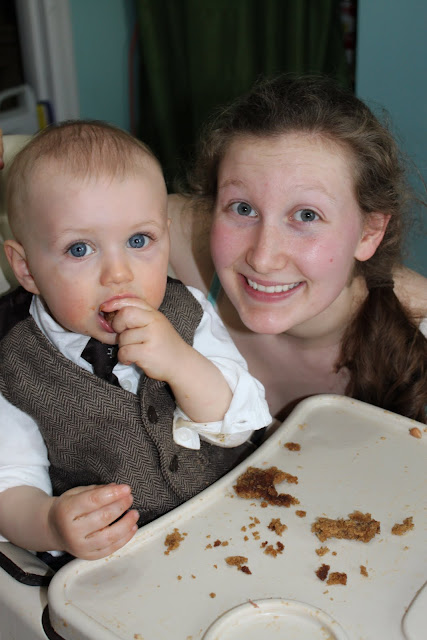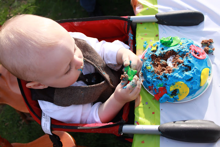 We threw two parties to celebrate the little guy's first year of life. We had a small party at home on his actual birthday with my side of the family. I made the tastiest oatmeal cake on the planet. It was the same recipe that my Mom used for my little brother Marshall's first birthday.