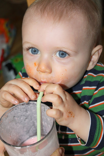 He likes to relocate items by placing them in drawers, buckets, and cabinets. I have a feeling that walking will only feed his relocating skills. He'll be jabbering away in another month. He says dada, mama, and will say hello if you hand him the phone. He's been imitating words and sounds like "woof woof".This week, he figured out how to use a straw. Drinking smoothies has never been so clean.