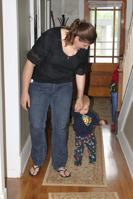 He started walking on Friday. From one end of the of the living room to the other. Stephen, Theresa, and I tossed his favorite stuffed animal back and forth to entice him. Each time he made it, he screamed in excitement. Too cute.