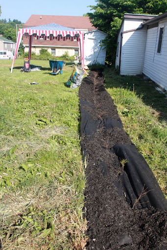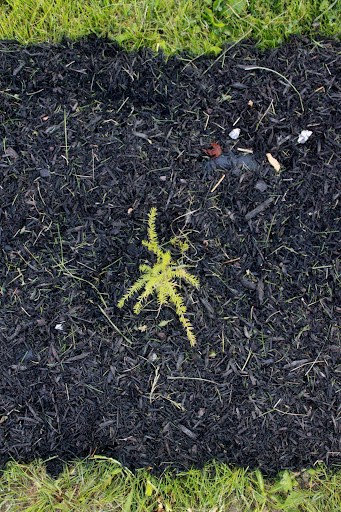 We planted the hedglings and put down a layer of mulch. Unfortunately, the one foot wide area didn't leave enough space for weed whacking or mowing around the hedge line without accidentally taking out the baby trees. So, the line of hedglings quickly became overwhelmed by very ambitious, opportunistic weeds. The mulch didn't really help to keep them at bay.
