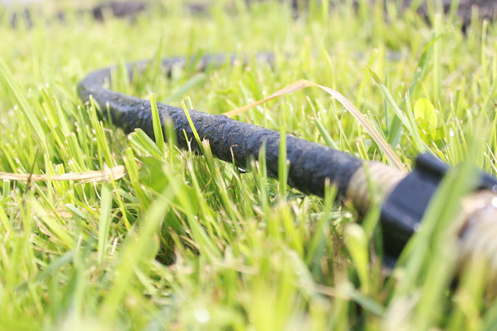 The soaker hose is great because it lets water slowly seep out directly under the roots of your plants. Since our hedglings were going through the trauma of being uprooted, mailed, and replanted, it was important that we keep them well watered until they were firmly established. With the soaker hose, we just have to hook it up with the regular hose, turn on the water, and walk away for an hour. No walking all the way around the yard to water 70 little trees.