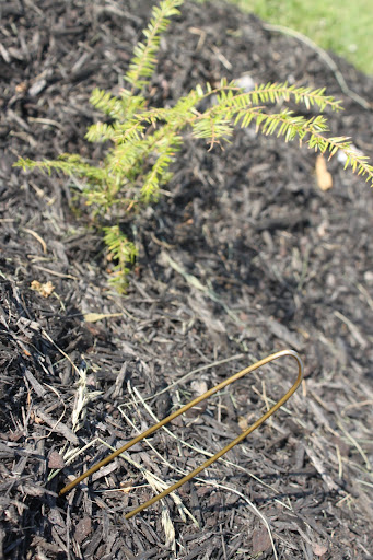 I found that the best way to get the pins into the ground was to step on them. Once in, I covered them up with a bit of mulch. And voila! All done!