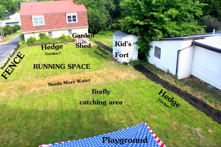 We are planning to run a white picket fence along the street side of the yard. On the outside of that fence, there will be a raised, narrow garden bed with lots of creeping plants. The concrete pad that used to be a dog run is the site for our much needed larger garden shed. The white smokehouse that is currently operating as our (too small) garden shed is going to be transformed into the coolest kid's fort ever. I think I want the hedges to get about as tall as the kid's fort. Maybe run some veggie/flower/herb beds in front of the hedges. I'll leave the middle of the yard wide open for firefly catching and games of tag. We'll set up a mulched playground area on the backside of the house. And lastly, we'll regreenify the grass growing over the old driveway.