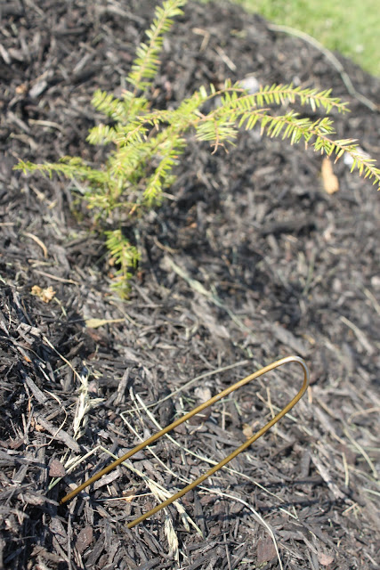 Lastly, to ensure that the landscape fabric doesn't shift around or try to escape in a gale force wind (a huge problem here in VA), my mom suggested that I cut up some metal hangers in order to create some really big bobby pins.