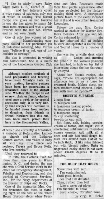"I like to study", says Ruby White (Mrs. L.S.) Corbin of [our town] and her interests cover a wide range of subjects, only one of which is cooking. The biscuit recipe she gives as her favorite is one she has given to many friends upon request and was a great favorite with the late Mr. Corbin and in her own family.