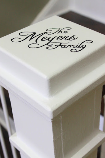 Since I'm STILL painting the balusters (kill me now), I'm not ready to reveal the full staircase to you. However, the newel post is 100% done, so I thought I'd go ahead and share the final result with you. That way, my sister-in-law Sarah can retract her devil woman accusation. ;)