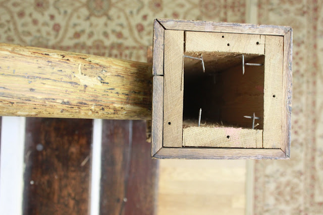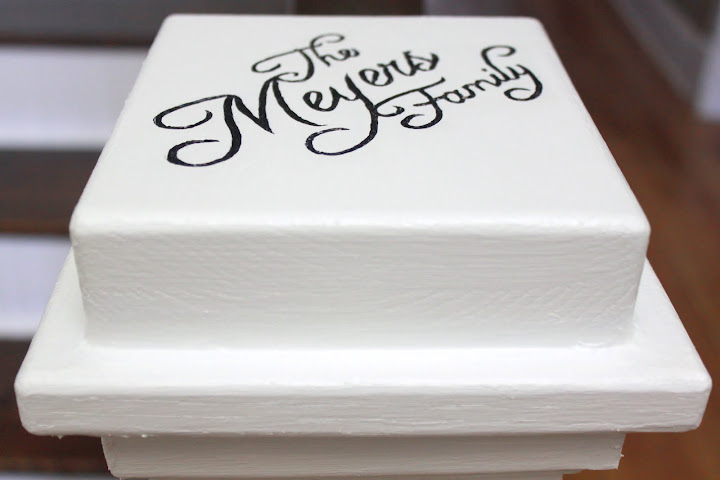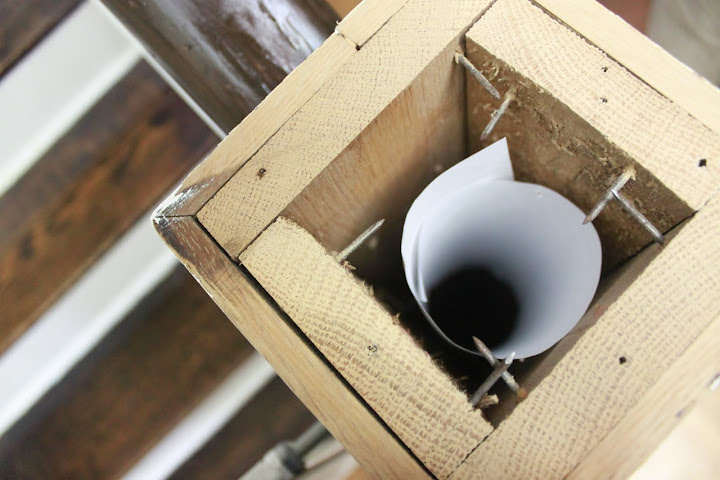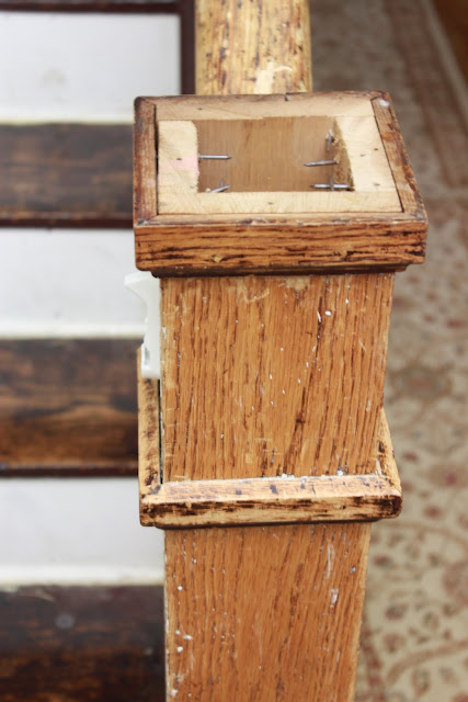 I really, really, really liked the all white, flat top of this newel post at NewlyWoodwards. I was pretty sure I could manage a basic square.