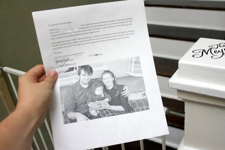A letter and a picture from our family to whichever crazy person decides to rip off the top of the newel post in the future.