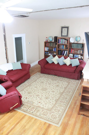 Each side of the room had a matching rug. For the most part, the couches were typically arranged in the front half of the room. We have a long couch, a medium length couch, a loveseat/ottoman, and a recliner that Stephen can't live without.