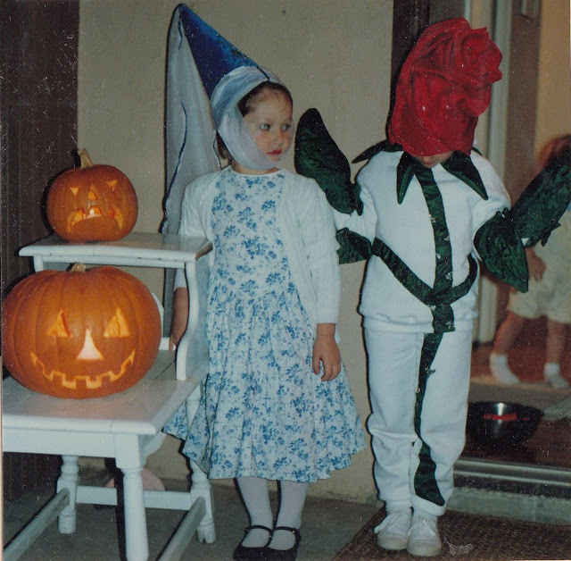 Really. Every other girl in the world wanted to be Belle that year. Me? I wanted to be The Magical Rose... because I'm weird like that. My Mom, supportive as ever, set about creating a rose costume for me. She's awesome like that. All I was missing was a glass dome to float around in. My Mom searched and searched for one of those clear, narrow dome umbrellas, but couldn't find one. That's ok. I was still a very, very happy domeless rose. Amy finally got to be a princess and she gave me her patented, "My sister is such a WIERDO!" look.