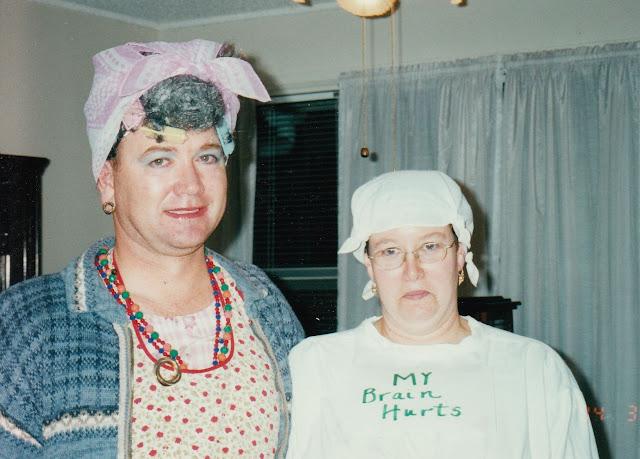 Amy, continuing to embrace black, was a ghoul. Kate was a Brownie. As in the miniature forest race in the movie Willow. The one's who prance around screaming, "I stole ze Baby!!" I was... a fairy queen? I was working part time at a community theater and had access to fluffy dresses in their costume department. What 14 year old girl turns down fluffy dresses? Never mind that I'm too old to be trick or treating. I was small for my age and young at heart.