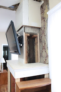 The hollow area beneath the suspended chimney will probably be turned into an Xbox storage area with a cabinet front. It can connect to the TV without ever. being. seen. (along with the TV cords) :) :) :)
