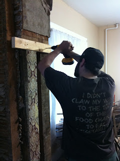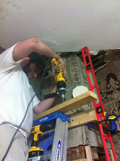 It was nothing but plaster walls for the first 6 feet. The brick chimney is suspended 6 feet in the air. It travels all the way through the second floor and up into the attic, but it doesn't go through the roof. I think the top of the chimney was dismantled the last time a roof was put on the house. All those bricks held up by some timbers. I can't tell you how comforting that is to me... You can see the lowest row of bricks right above the board Stephen is screwing in.