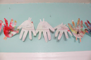 In the spirit of Daring to Give Thanks, I wrote something we were thankful for on the back of each turkey. For example, Joseph is thankful for getting to play outside and having a toy lawn mower. I know this, because he went and grabbed his lawn mower when I asked him what he was thankful for. See? I speak Toddlerese. I also wrote down many things which I am grateful for... such as my husband, fantastic sisters, our home, getting to be an aunt, etc. It's all there on the turkeys.