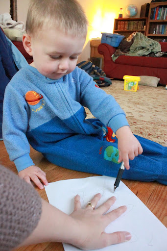 Step 2: Pin toddler's hand to paper and trace to the best of your abilities as he squirms all over the place and tries to escape because he doesn't think it's fun at all. Perhaps he thinks if I capture the shape of his hand on paper, I will be able to steal his soul?