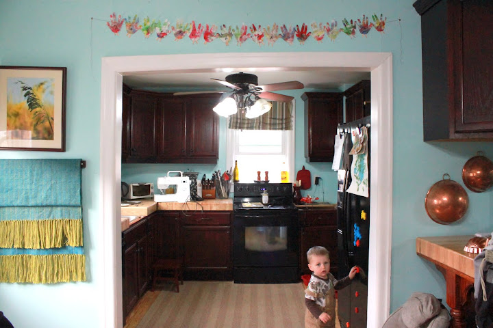 And, since I'm keeping things real... here's the banner with the view of my kitchen. The sewing machine is sitting on the kitchen counter because that's where I put the banner together, there are dishes and suitcases everywhere, and Joseph is methodically removing all of the ABC magnets from the front of the fridge. Because he's helpful like that.