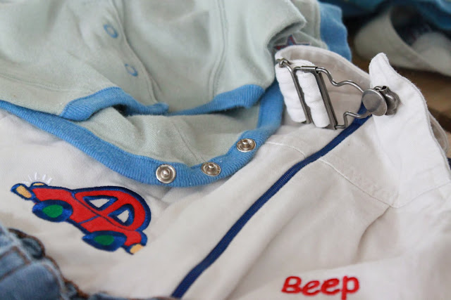 I still want to find some plastic buckles (such as the kind attached to shopping carts) and an article of clothing that requires lacing. Other than those two, I think I have a decent collection of clothing clasps for Joseph to practice on. That's about as far as I got before Joseph and I had to leave the house for a play date with friends.