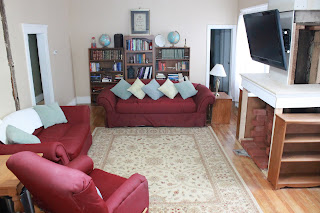 However, that still left an open doorway between the living room and the downstairs bath/dining room (the tiny narrow doorway in the back right corner).