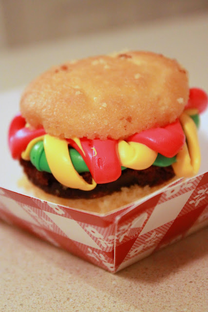 They are SO EASY! One vanilla cupcake cut in half, one biscuit sized brownie, and some colored icing for lettuce and condiments!