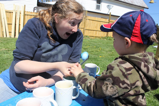 Then I helped Joseph *gently* place each egg in a mug of egg dye.