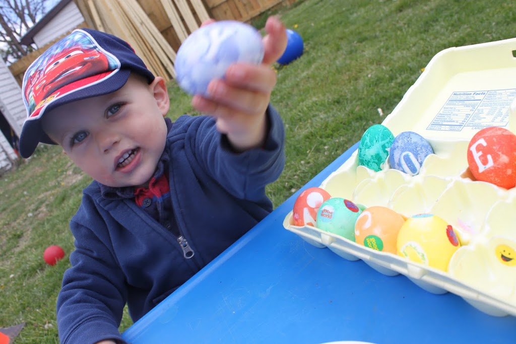 Joseph's favorite part was helping me "hide" the eggs by gently placing (...er...dropping from a foot above the ground) the eggs in the grass.