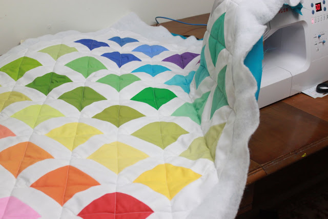 Then, during some conversation or another with Sarah, she gushed about this quilt for a good 2 minutes. And I quote, "I love that spectrum quilt like whoa. It is the Bees Knees. It is the most awesome quilt of all time." Clearly, she needed some quilted rainbow in her life. When she posted a picture of the same quilt as inspiration for her nursery in this post, it was all over. My niece was destined to sleep blanketed in happy rainbow squares. That was that.