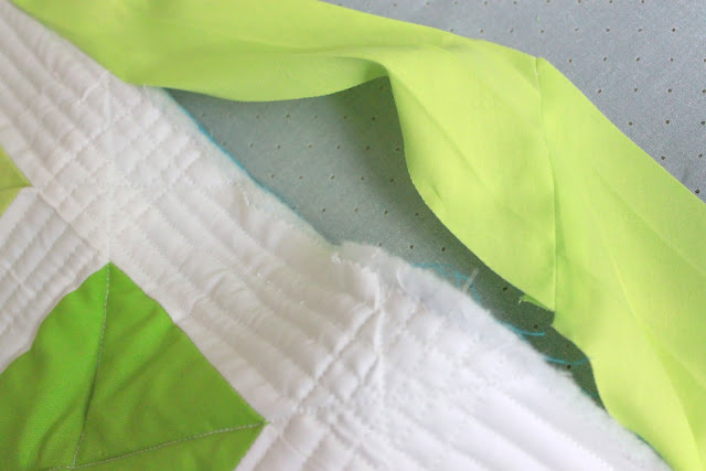 18) Fold the binding over to the other side and topstitch it in place around the entire quilt. Periodically check the other side to make sure you aren't missing the edge of the binding. I did this a few times and had to go back and stitch over those sections again.
