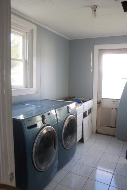 One of our first big home improvement projects was to rip down all of the wallpaper and lay new tiles. It made for a huge difference in the laundry room.