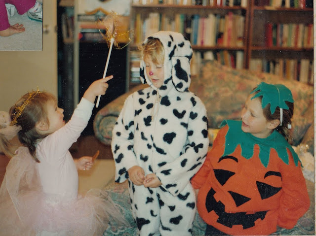 I was clearly in love with my fairy self. Amy was less than thrilled. She didn't have pink wings or a sparkly wand. So. Not. Fair. Also, having lived all of her life in Germany and having a naturally skeptical mind, Amy didn't trust this whole "Trick or Treat" thing. At the first house, Amy turned to my Mom and said something like this: "You expect me to believe that I just walk up to that door, ring the bell, and they will hand over the candy?! Yeah right! Good one, Mom."
