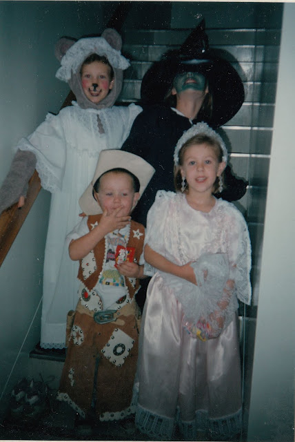 Amy, continuing to embrace black, was a ghoul. Kate was a Brownie. As in the miniature forest race in the movie Willow. The one's who prance around screaming, "I stole ze Baby!!" I was... a fairy queen? I was working part time at a community theater and had access to fluffy dresses in their costume department. What 14 year old girl turns down fluffy dresses? Never mind that I'm too old to be trick or treating. I was small for my age and young at heart.