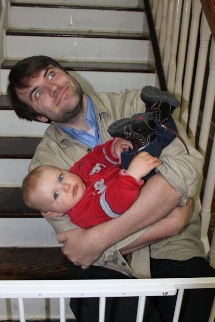 Of course, as little man got bigger and more mobile, the stretchy wrap became less practical. At this point, I made myself a non-stretchy wrap and tried out back carrying. This worked, but overall I found that this took a little more effort and that positioning the baby was a little more nerve-wracking than with front carrying. However, I've heard very good things about the Ergo carrying pack from multiple friends and family and would suggest trying that out (especially for stay at home parents). It's perfectly manly and could potentially suit grouchy fathers... er... I mean Rob.