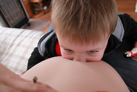 Yesterday, I convinced Joseph that belly smooches are the greatest smooches in the whole wide world. It's really cute too because he's into the awkwardly prolonged "mmmmmmmmmmmmmmmmmmmmmmmmmm" kisses. He likes to give them until his victim (usually his Mommy) starts giggling. Fortunately, they are all closed mouth kisses.