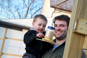 After all that work, we ended the weekend on a happy note. Stephen and Joseph filled up the bird feeder that Joseph's great grandfather made for him for Christmas and hung it on one of the new fence posts.