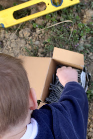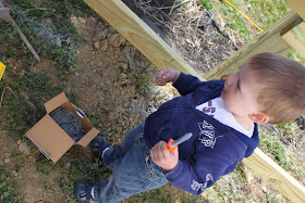 Stephen would say, "Thanks! Ok, go get me another one!" And off a very serious little Joseph would go to retrieve yet another screw. This lasted for about a half an hour before Joseph got bored & decided to go off and play in the semi-fenced in yard.
