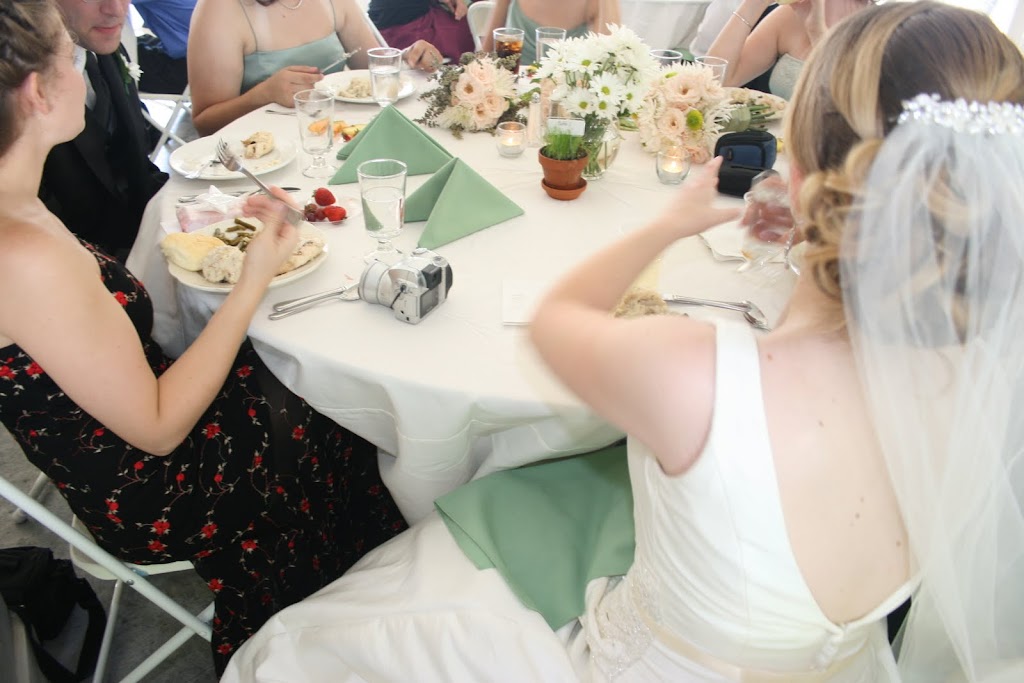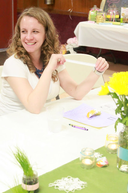 When Sarah first arrived at the shower and commented on the grass, I mentioned to her that the table decor was meant to mimic her wedding and provide continuity. She said we were going to make her cry. I just looked at her and said, "Dude. You have NO idea." Boy, was I right! Sneaky sisters. You can never trust them. ;)