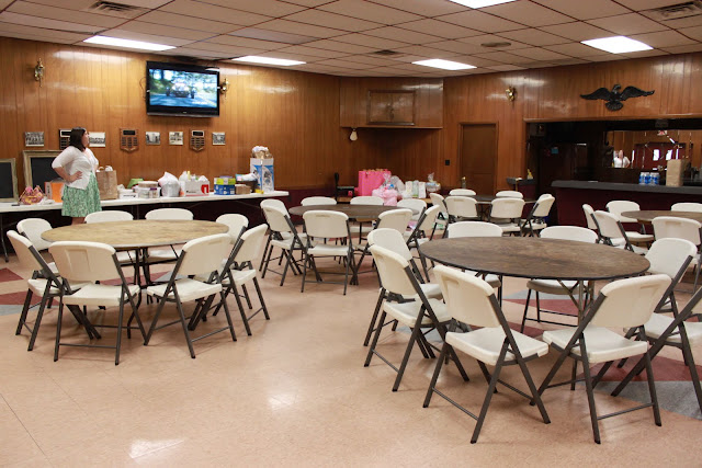 It's a good-sized banquet room where we hold most of our big family events (key phrase: "big family"). In terms of size, tables, chairs, etc. it's perfect for our family party needs. However, the wood paneling, the big screen tv, the score board, the bar area, and the trophies make the room seem very Man Cave-ish. Very. You can practically feel the testosterone resonating from the walls.