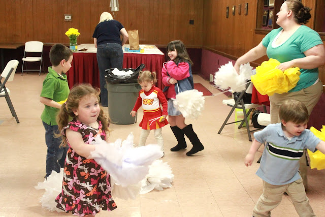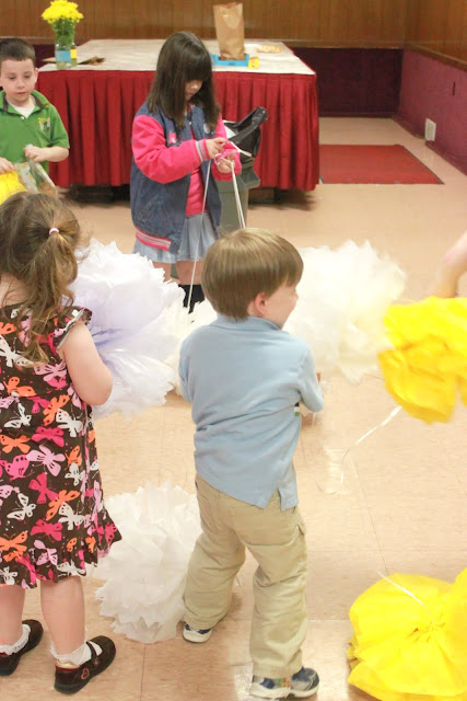 Also, did you know that tissue pom poms on strings make for a great free for all pom pom fight at the end of a party??