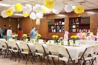 The morning of the shower, we sent Mom out for daisies. We had planned on white daisies like at Sarah's wedding, but told Mom that either yellow or pink would be okay too. She could only find yellow and I'm SO glad it turned out that way. They were so cheerful with the white & yellow pom poms.