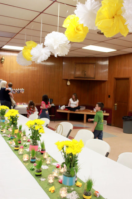 They almost didn't make it up because we couldn't find a ladder and the ceiling was too high for Theresa to just stand on a chair and hang them. Theresa rigged a broom handle with tape & the pom pom strings & tried to hang them from the panels that way. In retrospect, it was kind of hilarious, but at the time, the lack of a ladder was stressing me out, so I didn't think to take pictures of Theresa's frustrated attempts. So sad. Fortunately, Aunt Paula arrived early & saved the day by locating the ladder for us.
