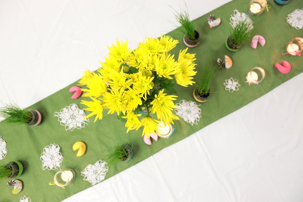 The green was too much as a whole table cloth and I never used it, so since the color perfectly suited our color combination and since Sarah loves green, I cut it up into 4 strips and sewed all the edges. Voila! Instant table runners!