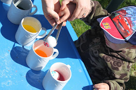 Then I helped Joseph *gently* place each egg in a mug of egg dye.