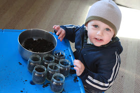 Then I gave him a jar full of grass seed and showed him how to sprinkle some into each jar.